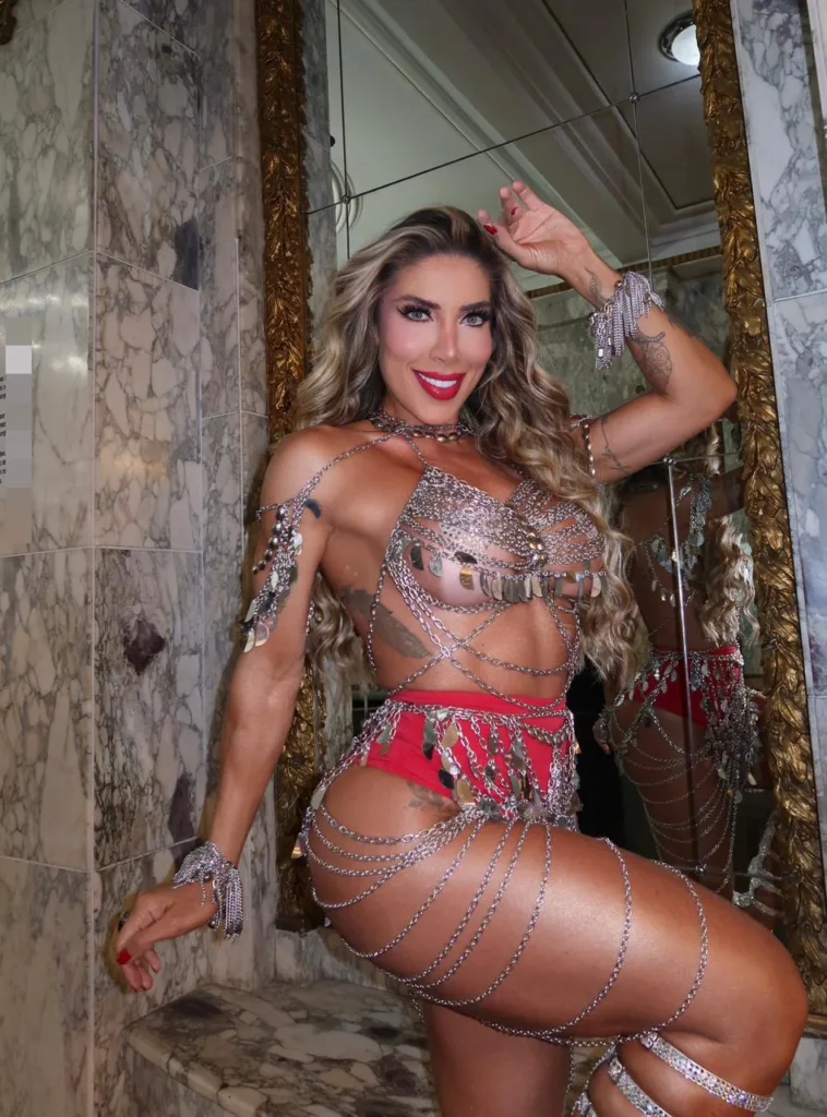 Para a ocasião, a musa apostou em um visual impactante, com look elaborado em correntes prateadas, reforçando o brilho, a personalidade e a presença marcante que já se tornaram sua assinatura nos ensaios da tricolor de Duque de Caxias.
