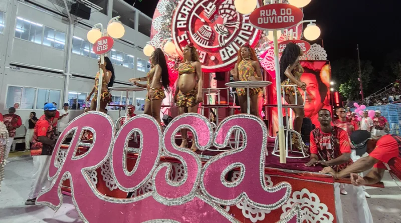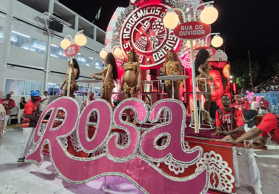 Nos detalhes que fazem uma noite virar lembrança, a avenida se emocionou. Viviane Araújo brilhou com leveza e simbologia, vestida de cisne em referência direta a uma memória marcante de Rosa. E o paradão da bateria ganhou clima de cerimônia: o som do violino atravessou o silêncio, bexigas coloridas subiram ao céu e uma luz rosa pintou a Sapucaí com um sentimento que não precisa ser explicado — parecia saudação, parecia agradecimento, parecia amor em forma de carnaval.