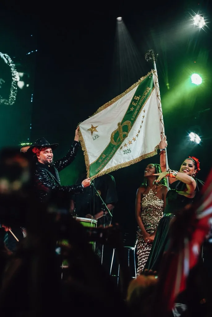 A cantora IZA, rainha de bateria da escola, também esteve no palco ao lado de Ney Matogrosso, emocionando o público ao som de “Casinha de Sapê” e “Balada do Louco”.